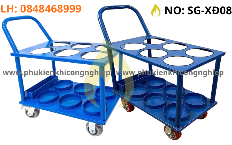 SG-XĐ08 không chỉ giúp tiết kiệm thời gian và công sức khi di chuyển nhiều bình oxy mà còn đảm bảo an toàn, giảm thiểu rủi ro đổ ngã, hư hỏng bình trong quá trình vận hành.