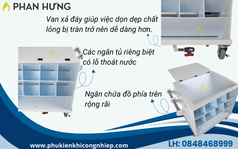Xe đẩy vận chuyển axit có các ngăn riêng biệt với van xả và các mối hàn kín liên tục, chống rò rỉ.